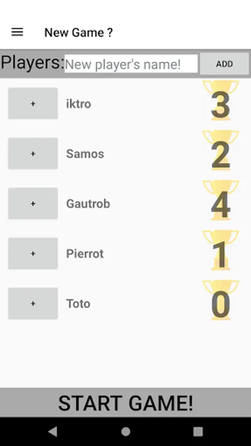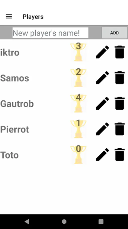 This app has been designed so that you don't have to worry about counting points at Mölkky anymore. It also counts the victories of each player in order to have an overview of each player's performance. Custom rules are coming soon !
