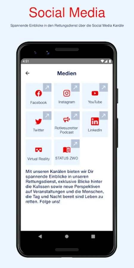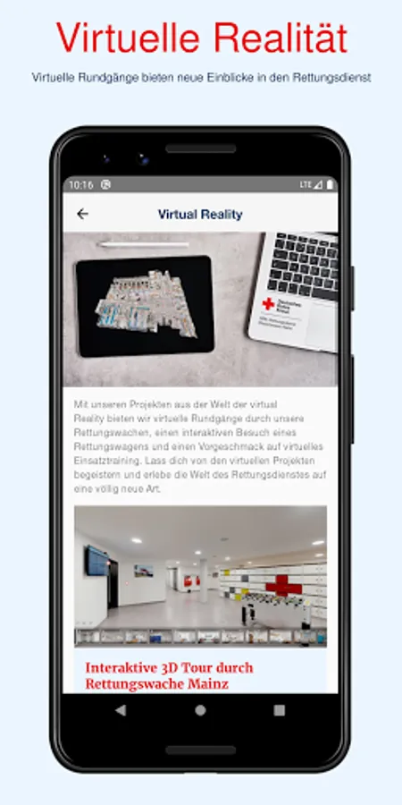 We regularly offer you new content with helpful information on emergency medical training, let you take a look behind the scenes of the emergency services and show you with interactive content how exciting the world of the DRC emergency services is. With the DRK-Retter4U app, you will not miss any new job offers and will always be the first to know when interesting events are pending. We also offer you 360 ° videos and 3D tours as a special experience!