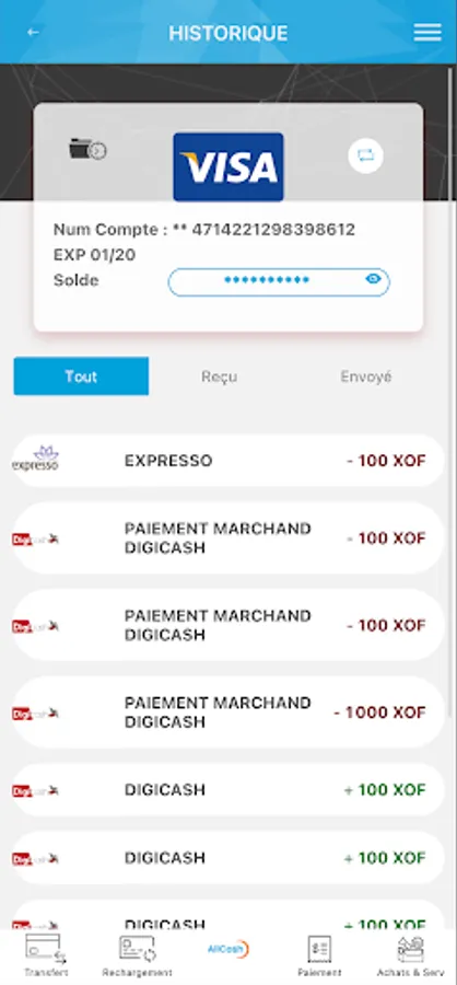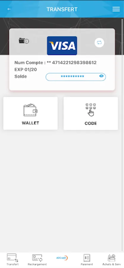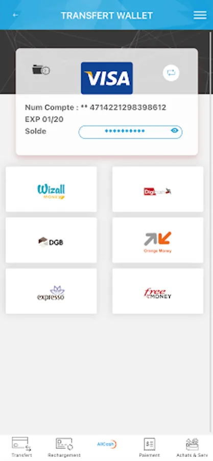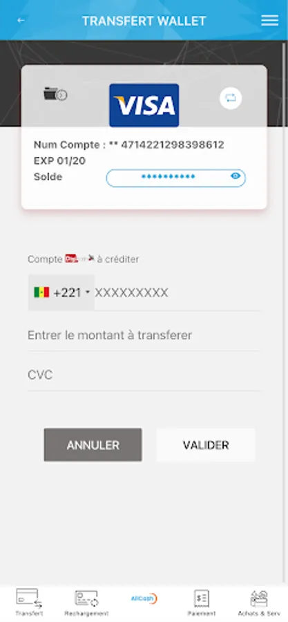 Allcash is a virtual mobile account (multi-operator GSM) associated with a visa bank card allowing the customer to carry out financial transactions: