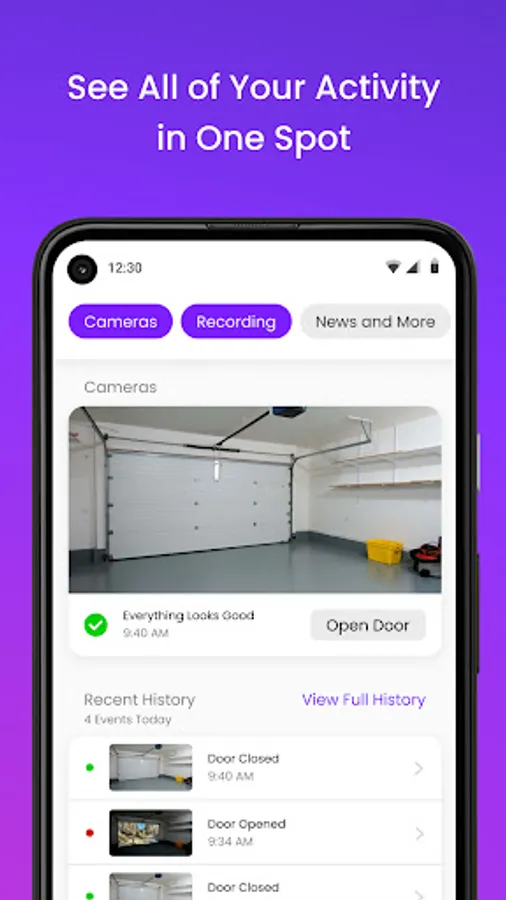 Configure push notifications for your garage door so you know when it has been opened or closed. With just a tap, jump straight to your live feed or a recording of the event.
