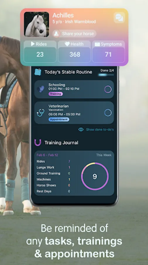 Organise your equestrian life, so that you can focus on completing all relevant tasks, while keeping tabs on upcoming appointments from vets or farriers, as well as a vaccination schedule. Keep your horse with you, at all times!