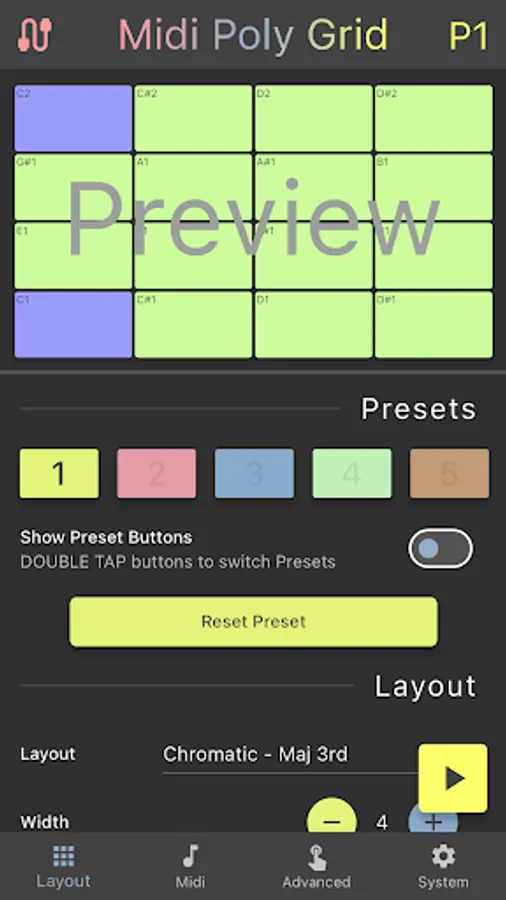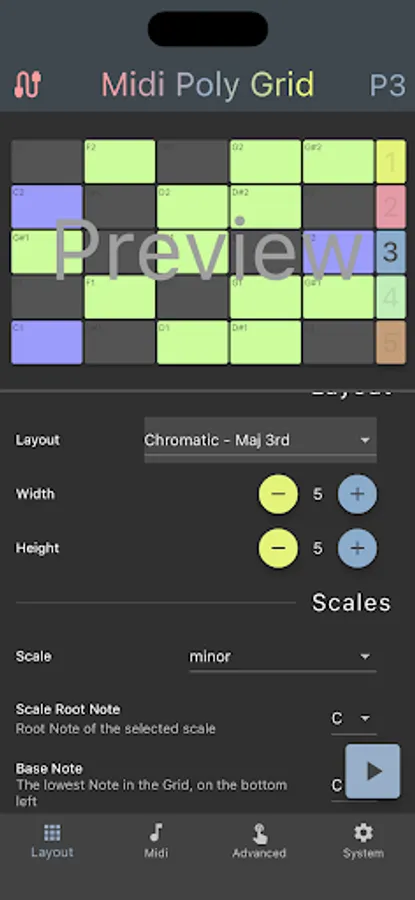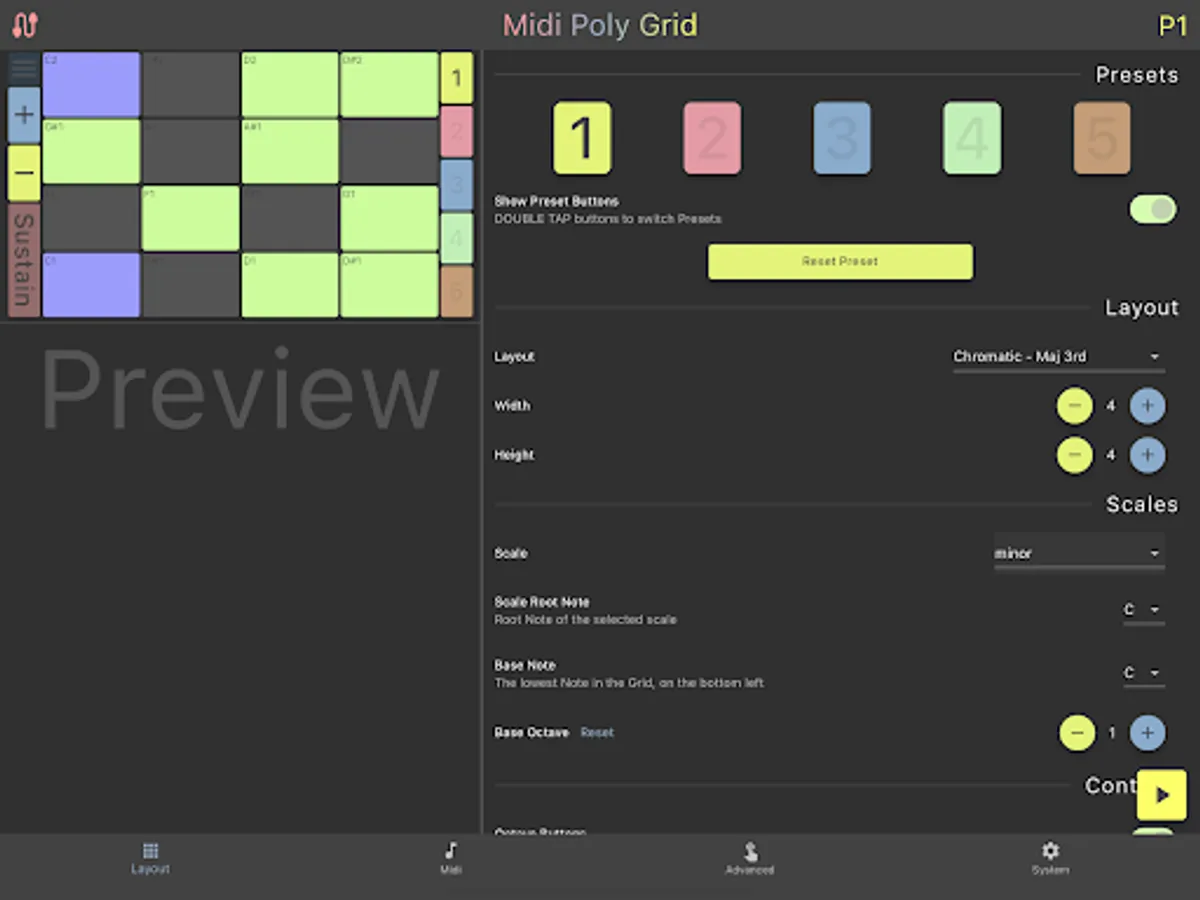 Midi Poly Grid is a lightweight Midi Controller app for mobile phones and tablets for melodies and finger drumming at home and on the go. Connections can be made virtually to other apps via platform midi channels or via USB to other devices.