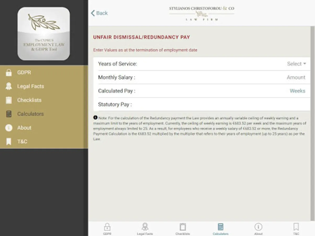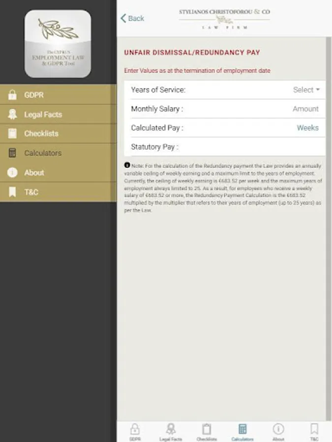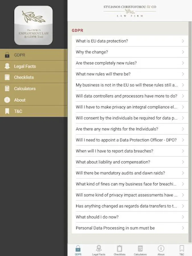 The application aims to inform and provide managers with an easy-to-use, mobile database of all matters regarding Cyprus Employment Law and the application of the General Data Protection Regulation (GDPR). The Stylianos N. Christoforou & Co. LLC team hopes to simplify your everyday work life with information at your fingertips, and without the bureaucratic burden of searching for it. Whether you are a General Manager, a Human Resources Manager, a Managing Director, or a Data Protection Officer (DPO) all the information about the general principles of Employment Law in Cyprus and GDPR is now instantly accessible for review and search by downloading "The Cyprus Employment Law and GDPR Tool".