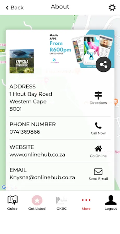 The Knysna Town Guide is a one stop business listing. Search app off contact details of businesses in Knysna. The Mobile App has listings form all industries ranging from Tourism to Personal Services and emergency contact numbers.