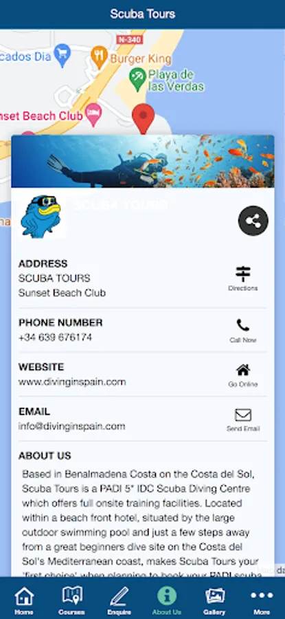 Scuba Tours is a PADI 5* IDC Scuba Diving Centre which offers full onsite training facilities. Located within a beach front hotel, situated by the large outdoor swimming pool and just a few steps away from a great beginners dive site on the Costa del Sol's Mediterranean coast, makes Scuba Tours your 'first choice' when planning to book your PADI scuba diving adventures in Spain.