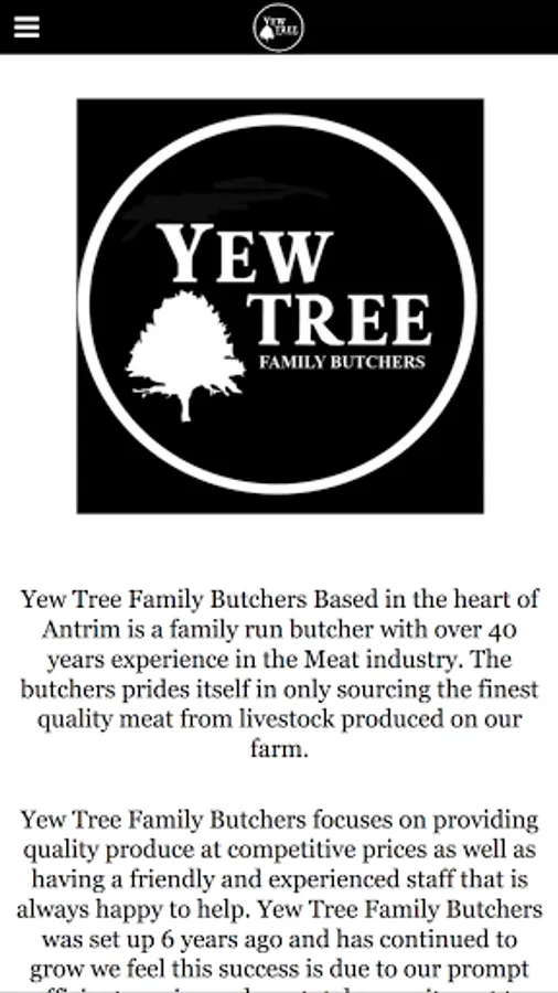 Yew Tree Family Butchers Based in the heart of Antrim is a family run butcher with over 40 years experience in the Meat industry. The butchers prides itself in only sourcing the finest quality meat from livestock produced on our farm. Yew Tree Family Butchers focuses on providing quality produce at competitive prices as well as having a friendly and experienced staff that is always happy to help. Yew Tree Family Butchers was set up 6 years ago and has continued to grow we feel this success is due to our prompt efficient service and our total commitment to constant quality food. We offer the highest quality fresh meat and poultry along with a wide range of home made pies along with also having freshly made farmhouse apple and rhubarb tarts available. We have a whole range of quality meats and local produce available. Our selection of meats includes some of the finest beef, pork, free range chickens, ham, poultry, sausages and burgers. All of which is fresh and of great quality and we also stock free range eggs. We will also put together BBQ packs, meat hampers or meat packs to your specification- just ask in store for details & to place your order. So whether you are looking for a beef joint for Sunday dinner, burgers for a barbecue or a nice steak then Yew Tree Family Butchers is the place for you. Now is the time to place your order for your black and white turkey’s or your goose for your Christmas dinner, all free range again produced on our farm.