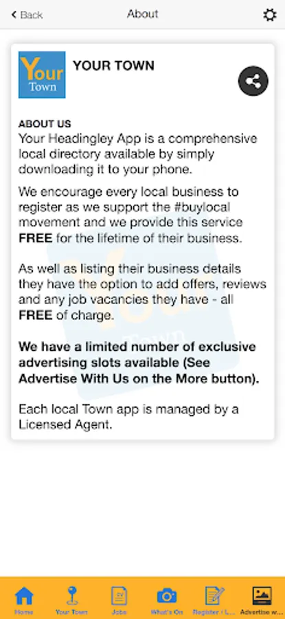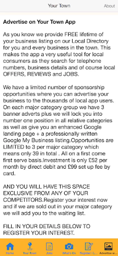 The Your Town app is an app designed for businesses to advertise their services, products, jobs and offers locally and for you the user to find and take advantage.