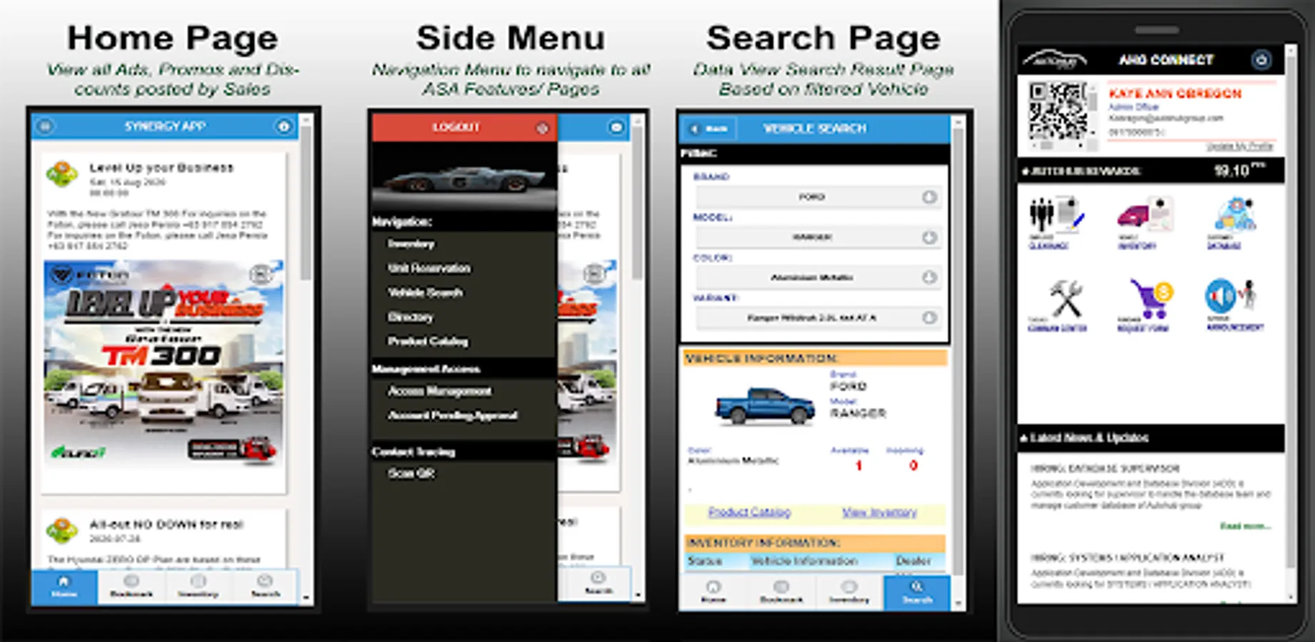 AUTOHUB CONNECT is also designed for Sales Consultant where they can search availability of vehicles inventory from models, colors up to specific vehicle variant in a real-time scenario. Aside from vehicle inventory monitoring, this app is also being used as a tool to automate business processes and prevent the use of papers and manual approval in response to the Covid19 crisis and improve safety and health protocol within the company.
