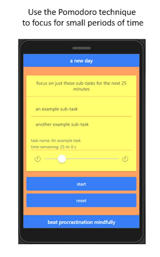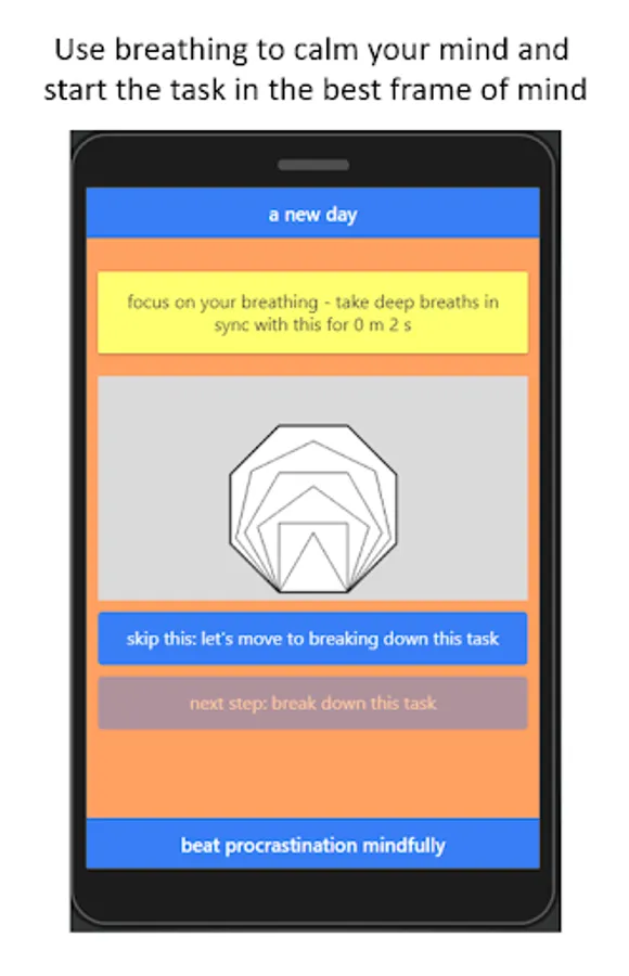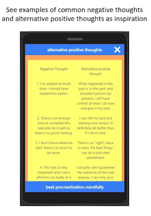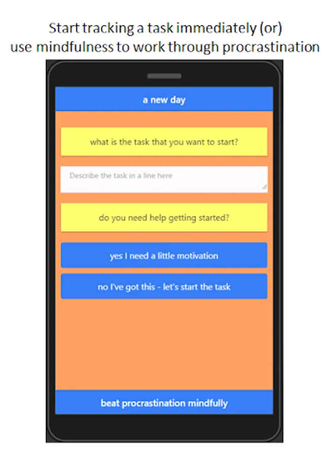 One of the underlying causes of procrastination are the negative emotions associated with the task. This app uses mindfulness and cognitive behavioral techniques to tackle procrastination at its root by identifying and consciously changing the negative thoughts associated with this task. Secondly procrastination is almost always related to starting a task, once started most of us can continue working without issue.