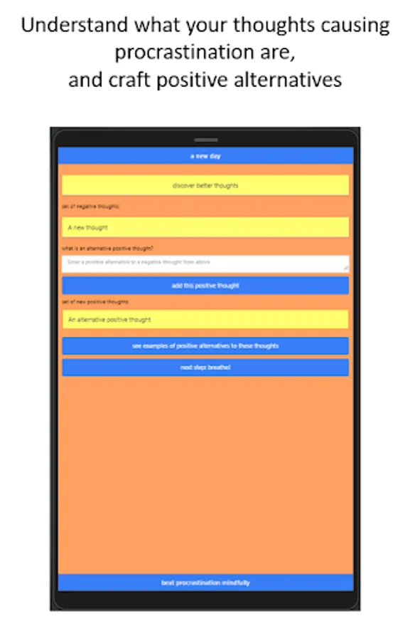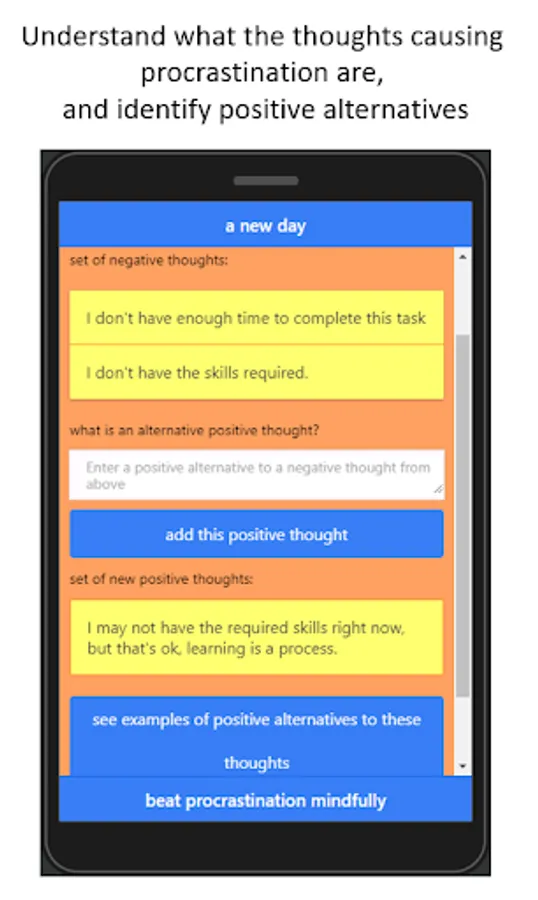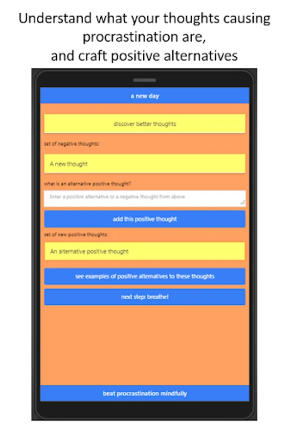 The app intends to provide an approachable, guided technique to this process. Each step is meant to be fairly easy, while taking you one step closer to getting started on a task. We start with describing the task, we then understand our emotional state. Documenting and observing our emotional state and describing it can in itself reduce the tumult of emotions. The next step is to identify the underlying thoughts that cause the unpleasant emotions associated with procrastination, the app provides a set of common thoughts that most people who procrastinate face. Once these thoughts are documented the next step is to talk back to them and provide alternative positive thoughts, again, examples are provided. Once we've fought our negative thoughts, we can actually start working on the task.