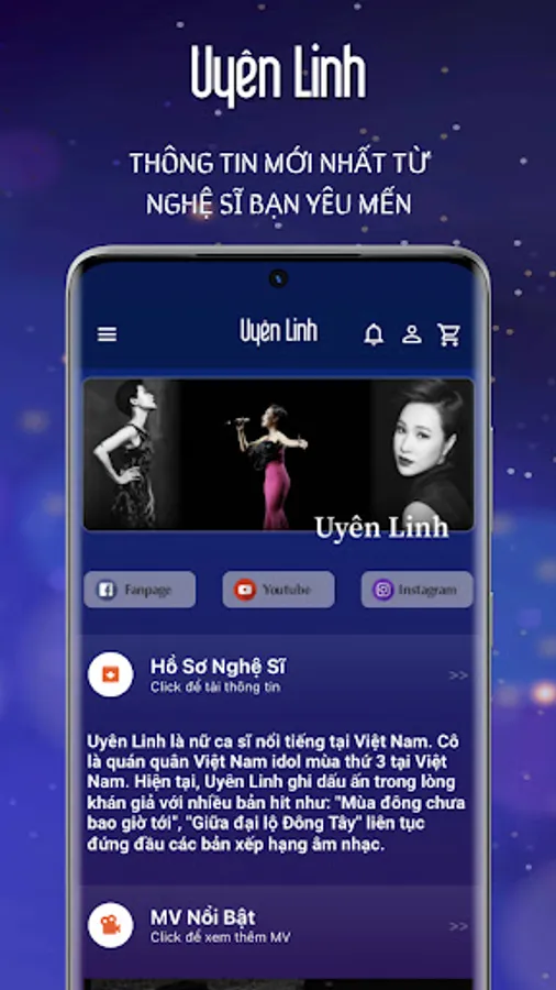 Welcome to Uyen Linh App. With the application, you can quickly update the latest news about the female singer. In addition, you can also interact and entertain with Uyen Linh's extremely attractive music and video store.