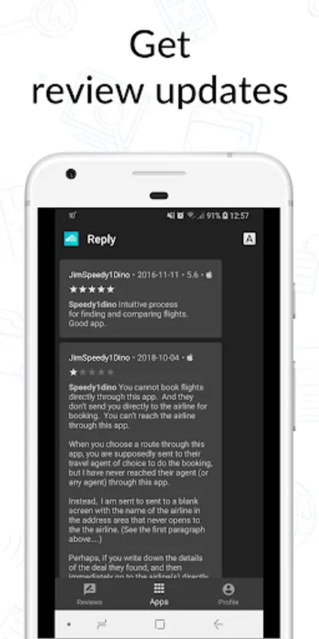 Streamline your app review management workflow with more convenient access to user feedback on a daily basis. Reply to reviews directly from the app and help your users. You don’t have to use Google Play Console or App Store Connect for it.
