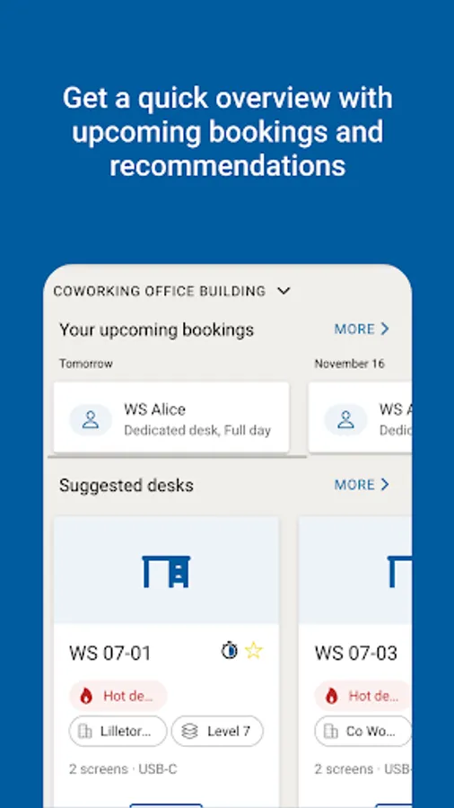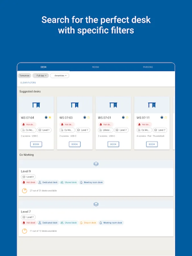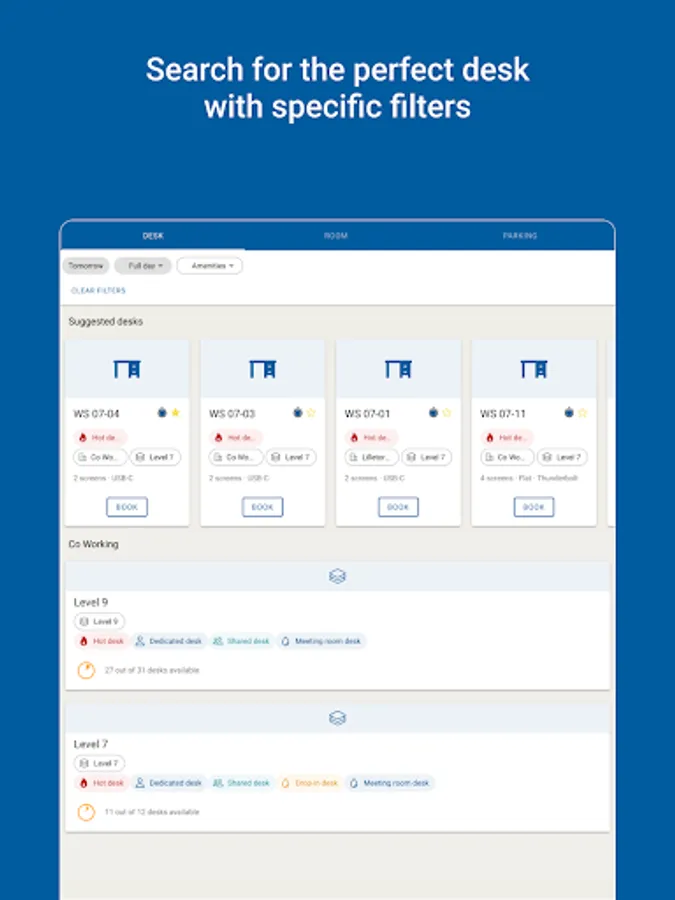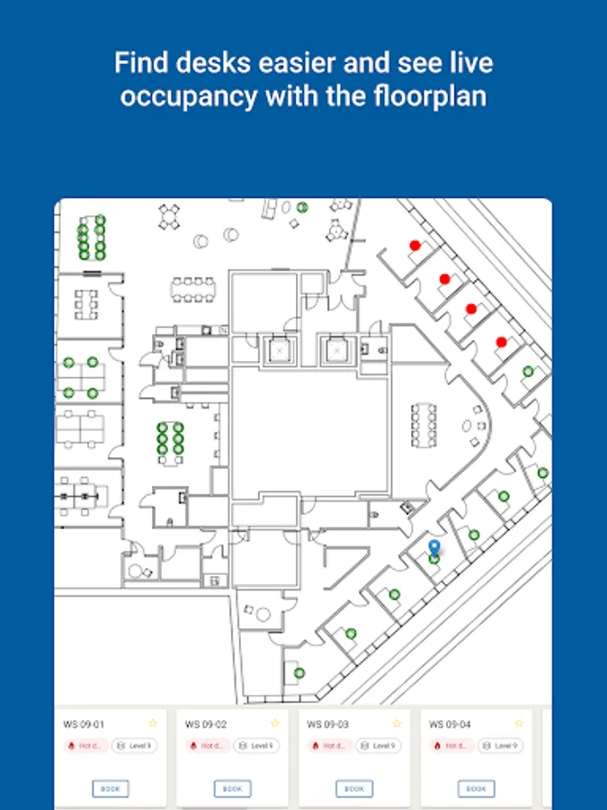 You will be able to book a hot desk, find an available drop in desk, coordinate your shared desk or give access to your dedicated desk.