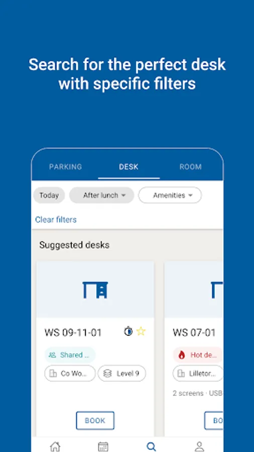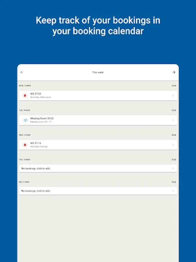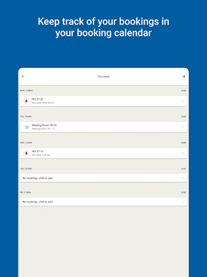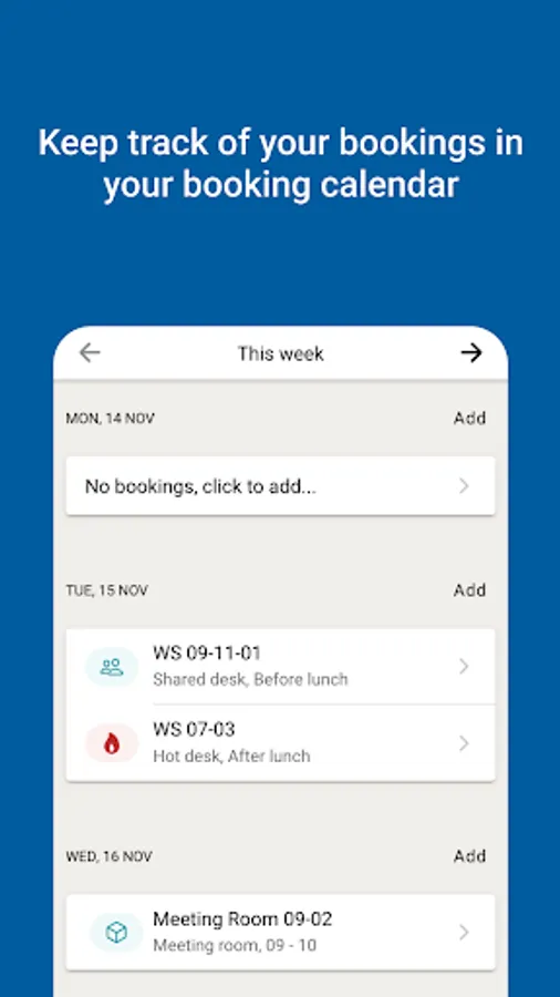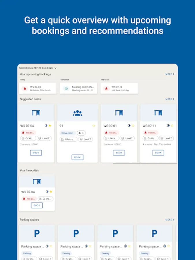 Based on your organisational setup you will be able to book available desks, parking spaces or special work or social areas.