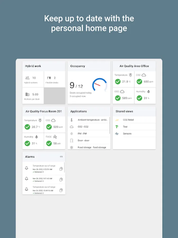 Depending on the types of sensors you have installed at your workplace, you can monitor occupancy, leaks, food storage, temperature, humidity, CO2, Radon, PM, and TVOC.