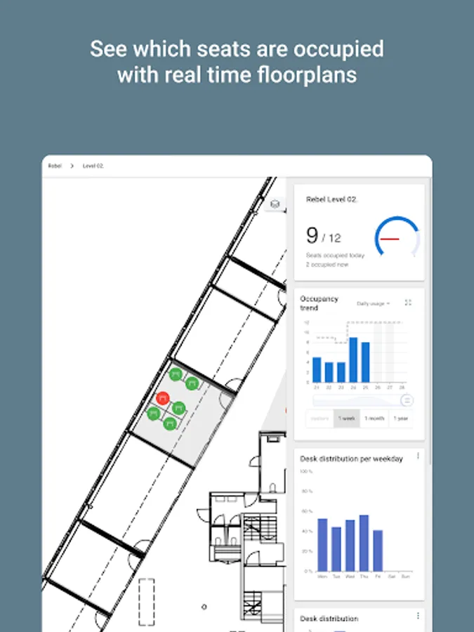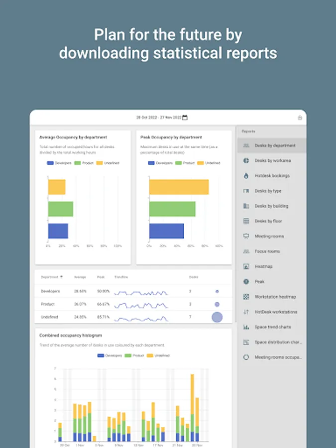 With customizable dashboards, statistical reports and analytics, you can plan for the future and make the necessary changes to improve your organization’s indoor air quality, booking capacity, and the general conditions of the building.