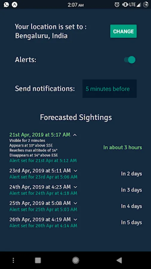 Get a notification at a user defined time interval before an ISS sighting occurs.