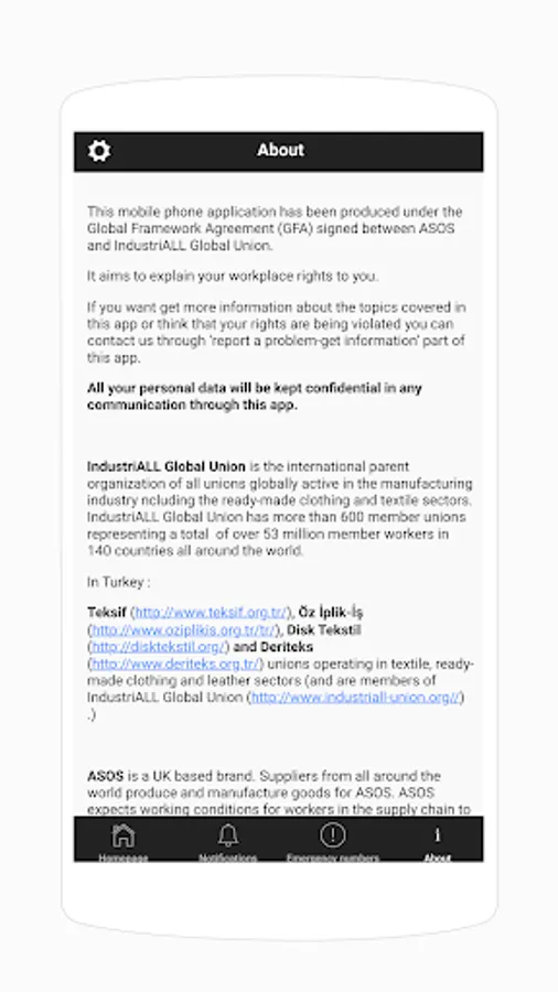 This mobile phone application has been produced under the framework of Global Framework Agreement (GFA) signed between ASOS and IndustriALL Global Union. It aims to explain workplace rights to workers in ASOS supply chain in Turkey. If you want get more information about the topics covered in this app or think that your rights are being violated you can contact us through ‘report a problem-get information’ part of this app. All your personal data will be kept confidential in any communication through this app.