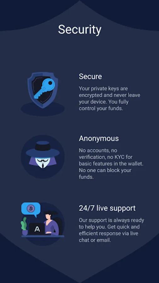 Atomic is fully decentralized application. We don't store any of your data, don't require any verification for basic services. We never have access to your funds.