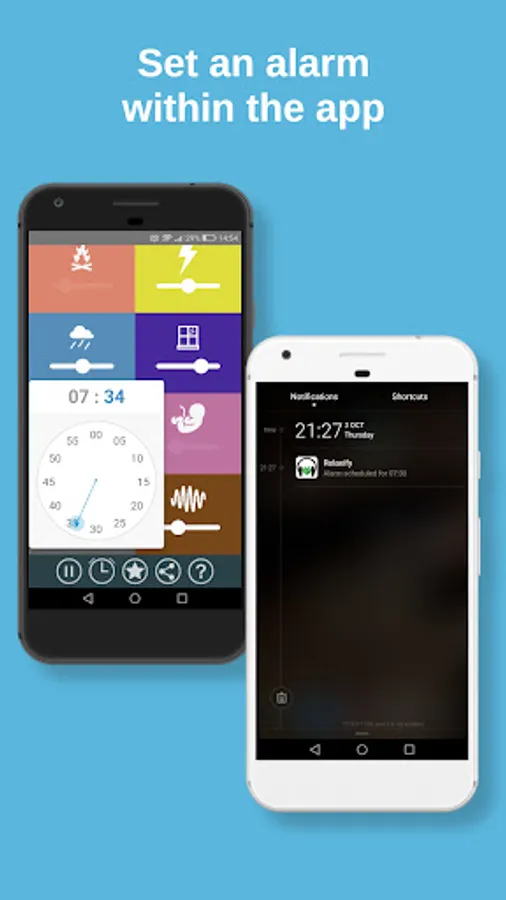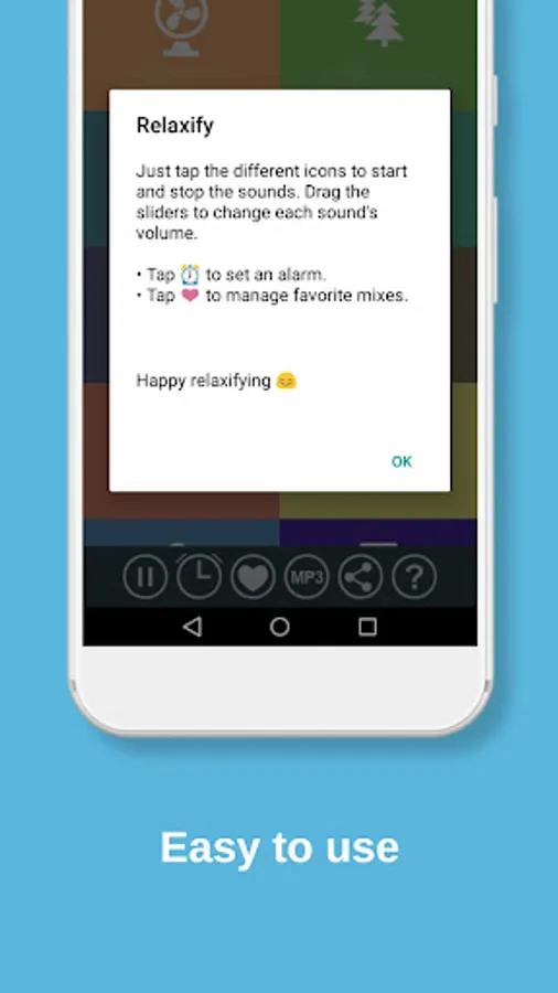 The sounds all have different lengths, so mixing them means no repeating loops! Relaxify has a built-in alarm and you can even load an MP3 track to loop in the background - perfect for mixing music with rain sounds!