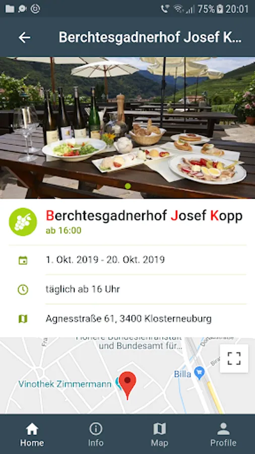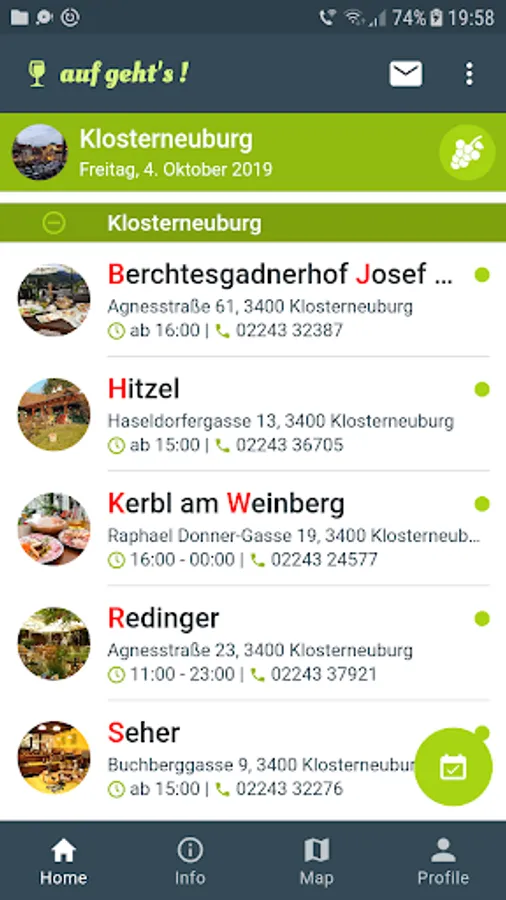Here we go ! allows you to quickly and easily find all Heuriger, gastronomy and accommodation establishments as well as events within your community. The list of entries is made in color-coded categories: