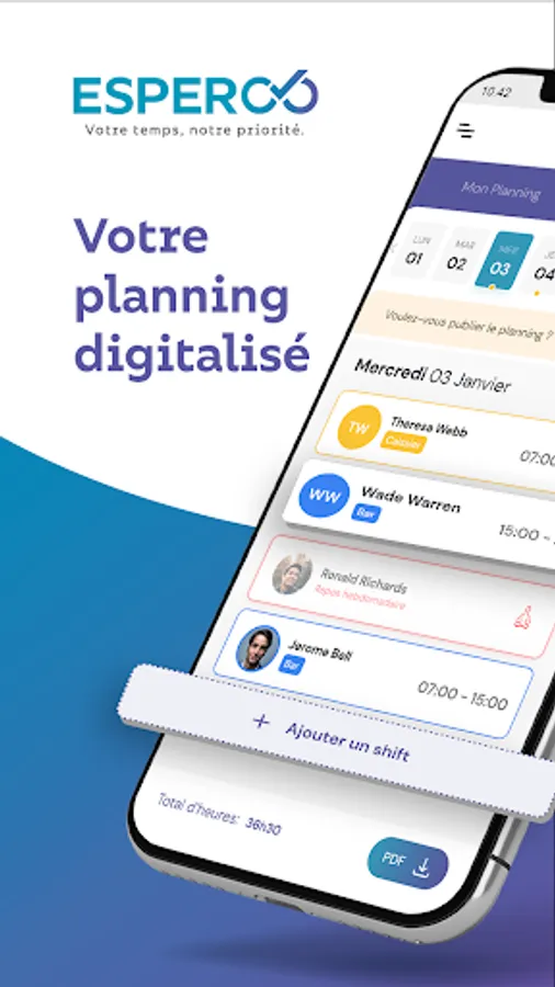 Discover Esperoo, the essential mobile solution for optimal management of your schedules and your working time. Our app guarantees smooth collaborative communication within your team.