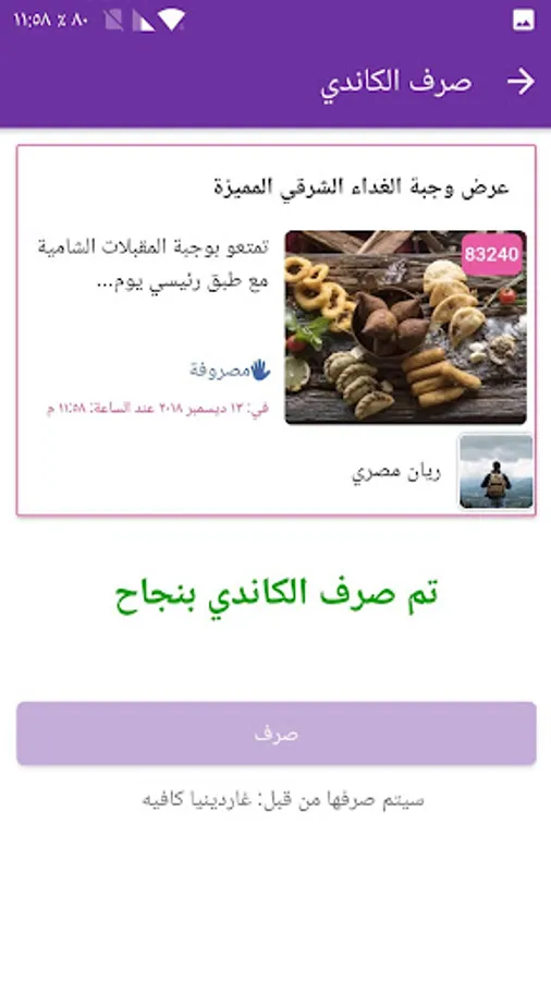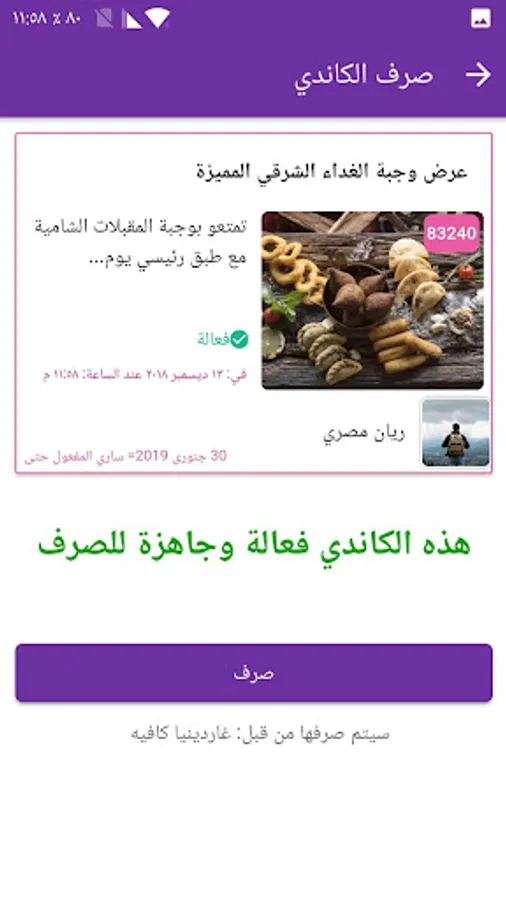 ب- عند زيارتك للتاجر, قم بتقديم الكاندي على شاشة هاتفك الذكي للتاجر, والذي سيقوم بصرف الكاندي وذلك اما بمسح الرمز الخاص بها ,أو بادخال رمز الصرف الخاص به على شاشة هاتفك(في هذه الحالة يجب أن يتوفر اتصال انترنت فعال على هاتفك الذكي).