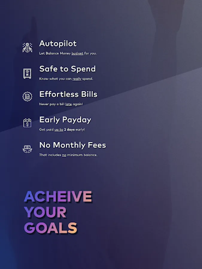 Balance Money® is a personalized-banking solution built to empower you, giving you more control of your finances. We automate everyday financial tasks, provide budgeting tools and give insights aimed at helping you achieve your financial goals. After all this app was built for YOU!