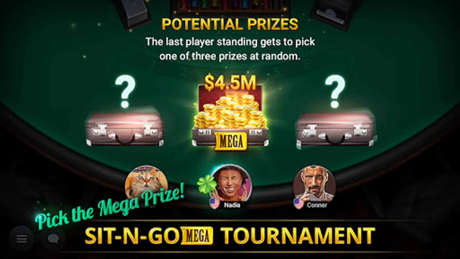 • SIT-N-GO MEGA TOURNAMENT : Aim for MEGA PRIZE which is 50 times larger than BUY-IN at the SIT-N-GO MEGA.3 potential prizes will be decided from the start of the game and the final winner gets to choose one among the hidden prizes.