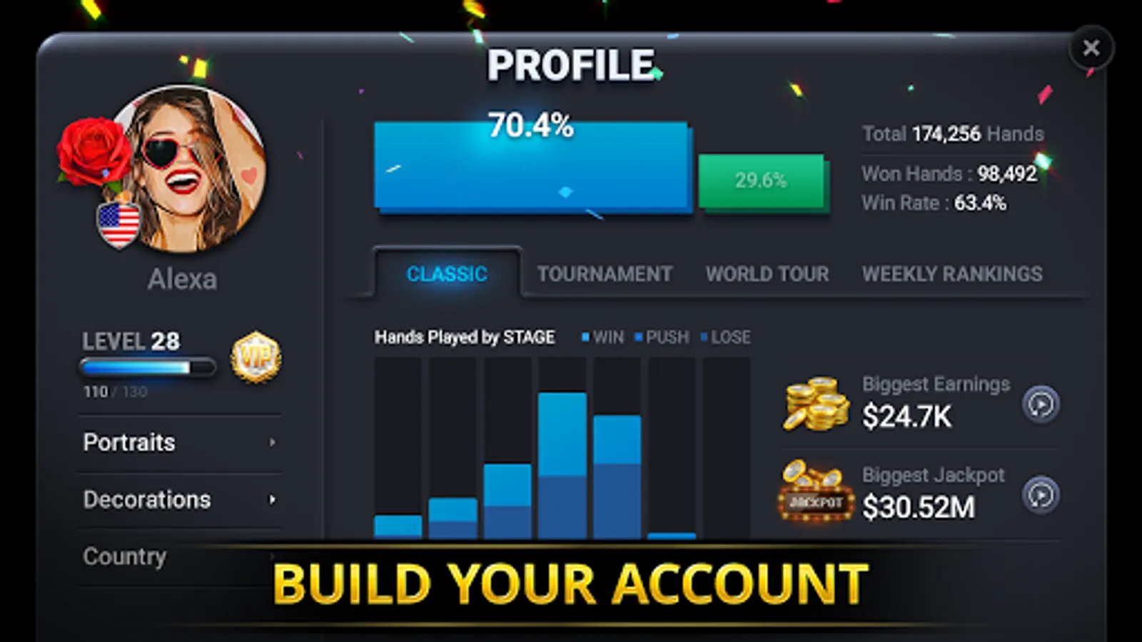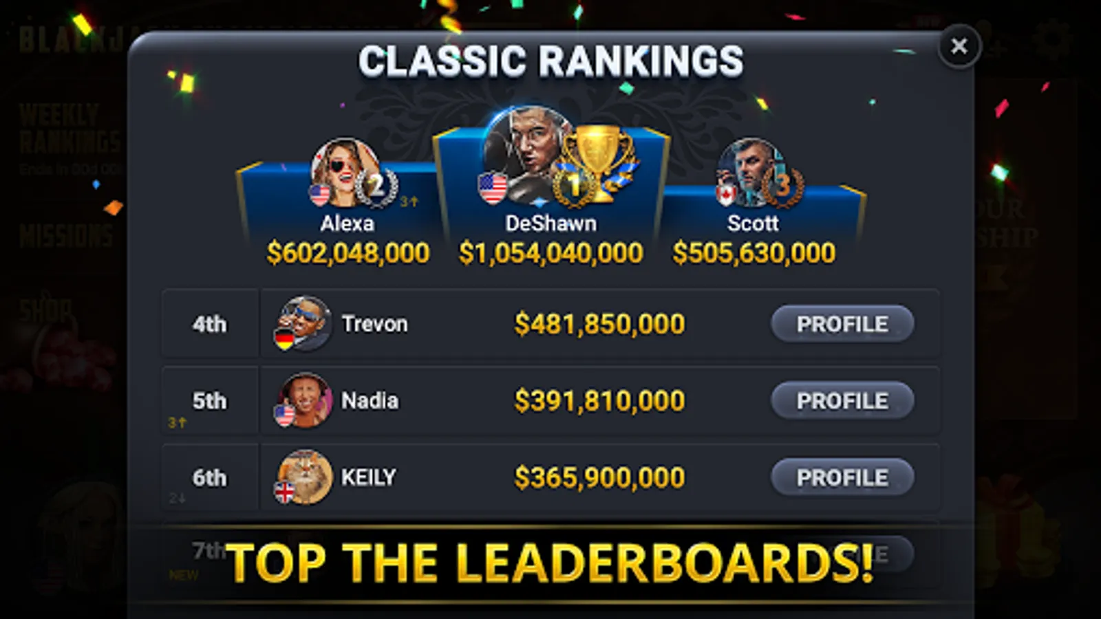 • WEEKLY RANKINGS : Compete with outstanding Blackjack players throughout the world in real time and be the world champion!