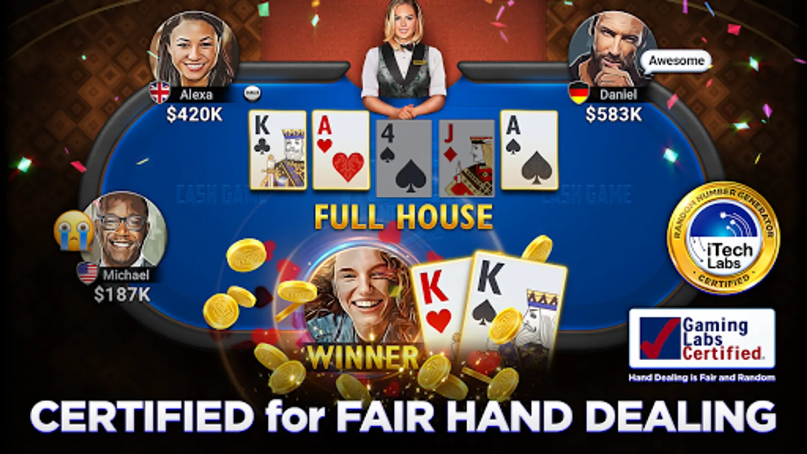 The strong Random Number Generator (RNG) implements every hand dealing of Poker Championship, thereby ensuring absolute fair game. Our game has been certified by Gaming Laboratories International, the global leading company in gaming and lottery testing.