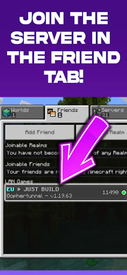 5️⃣ The server should now appear in the Minecraft friends list. Click on it to join.