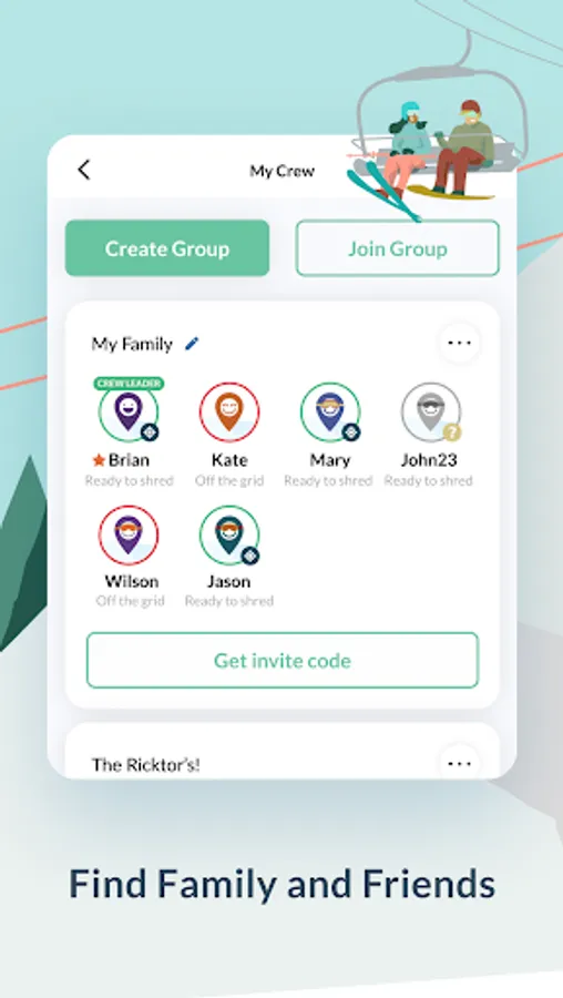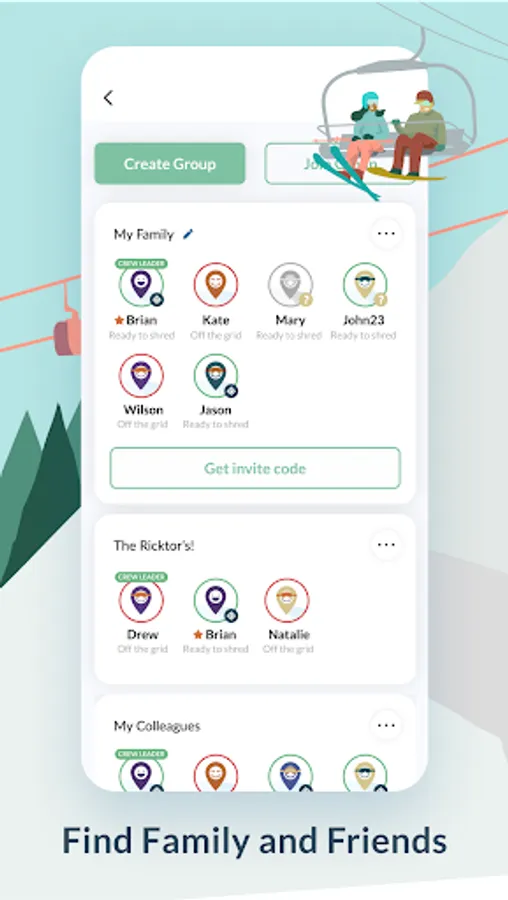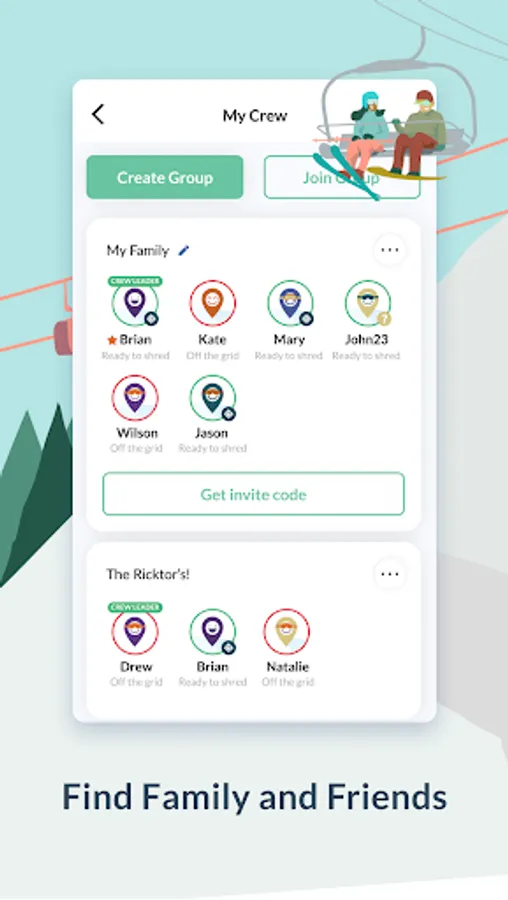 • Find Family and Friends - Create groups and locate your family and friends (crew) on the mountain in real time.