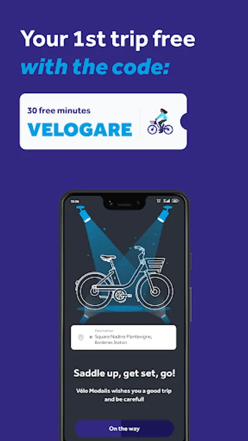 Take control of an electric bicycle with the code VELOGARE and enjoy 30 minutes for free on your first ride.