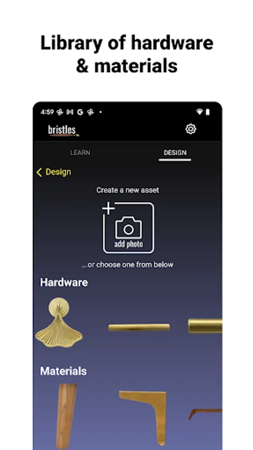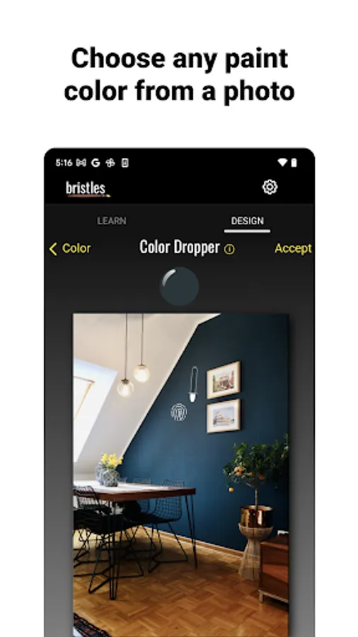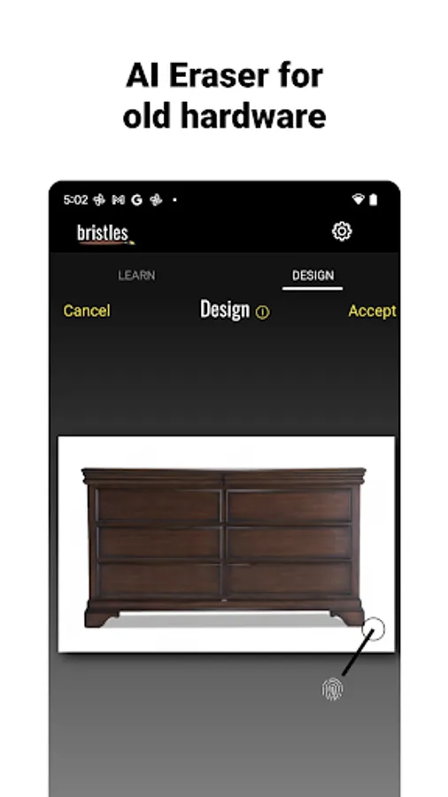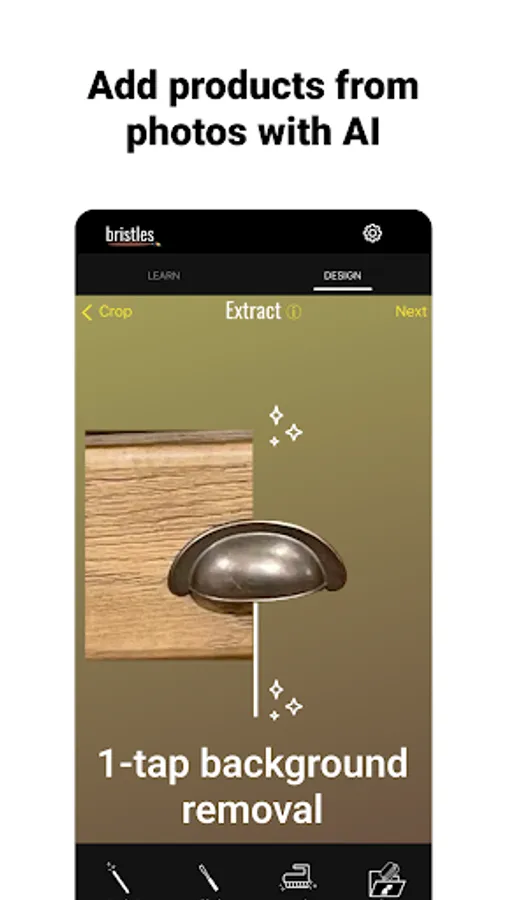 Bristles helps DIYers visualize their creative ideas for transforming furniture, interior spaces, and exterior spaces with new paint and materials. Upload a photo of your furniture or room and tap on our idea generator to visualize new ideas. You can start from a generated idea and customize your design from there or start from your own photo if you have a specific idea in mind. Try our app! Start with a 7-day free trial and see if our subscription is right for you.