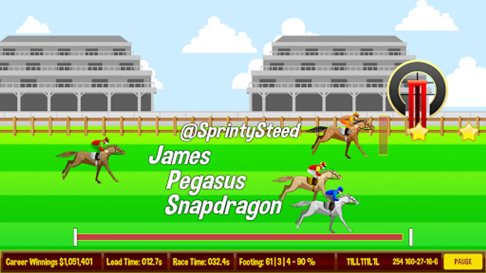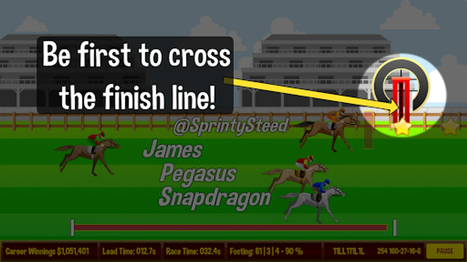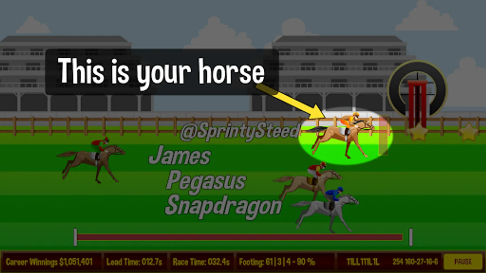Sprinty Steed is an easy to play horse racing game suitable for everyone! It has a very simple play mechanic so you don't need to know anything about horse racing, but you might find it to be more fun if you know what a horse is 😄