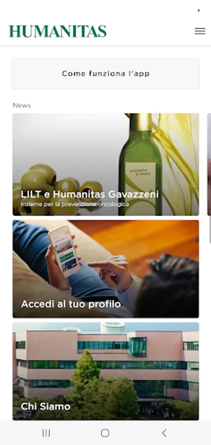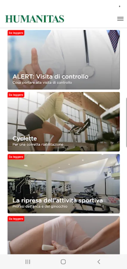 Thanks to Humanitas Bergamo, you will benefit from personalized content sent by your doctor or healthcare facility. You will be able to manage check-ups, send feedback on your state of health, perform rehabilitation exercises and actively participate in taking charge of your state of health. It will allow you to keep track of all received and sent information and easily share it with loved ones. All this for free and in full respect of privacy.