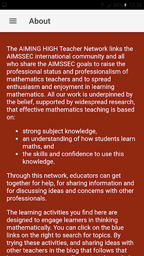 The AIMING HIGH Teacher Network links the AIMSSEC international community and all who share the AIMSSEC goals to raise the professional status and professionalism of mathematics teachers and to spread enthusiasm and enjoyment in learning mathematics.