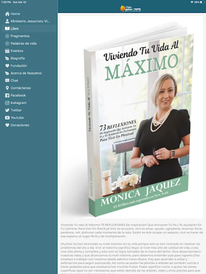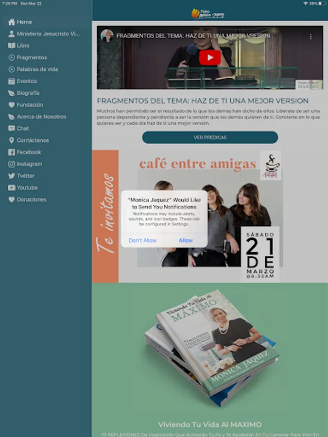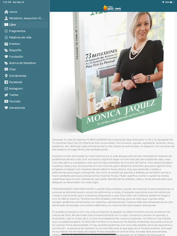 En el App de la Pastora Monica Jaquez podras acceder a videos completos de sus mensajes y eventos semanales . Nuestro propósito es que el evangelio del Reino se siga expandiendo y miles de personas puedan seguir los pasos de Jesús.