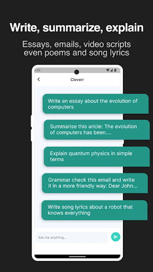 Additionally, Cleverr ChatGPT AI Assistant is the perfect tool for anyone who wants to improve their writing skills and write more effectively. With advanced AI-generated algorithms, this app provides grammatically correct and well-structured writing that can help you communicate your ideas more clearly. Whether you're working on a school essay, writing a business email, or simply jotting down notes, Cleverr ChatGPT AI Assistant has everything you need to get your thoughts down on paper.
