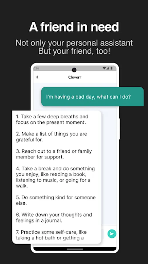In conclusion, Cleverr ChatGPT AI Assistant is a comprehensive and versatile virtual assistant that can help you with a wide range of tasks, from content generation and essay writing, to Q&A and natural language processing. With its user-friendly interface and accurate responses, this app is the perfect alternative to traditional virtual assistants and the perfect tool for anyone looking to improve their communication skills. Whether you're a student, a business person, or simply someone who enjoys engaging conversations, Cleverr ChatGPT AI Assistant is the perfect app for you!