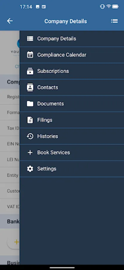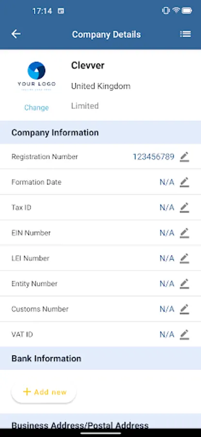 - Easily accessible overview of important company data.g VAT number and legal documents