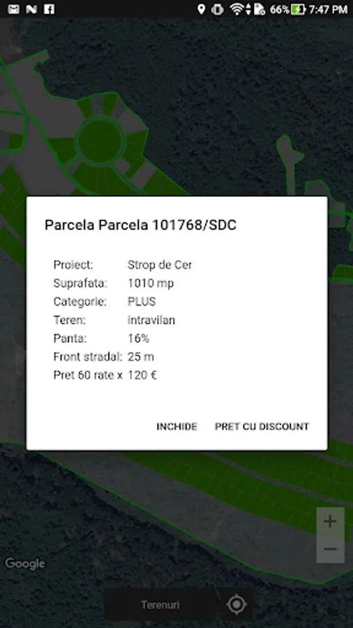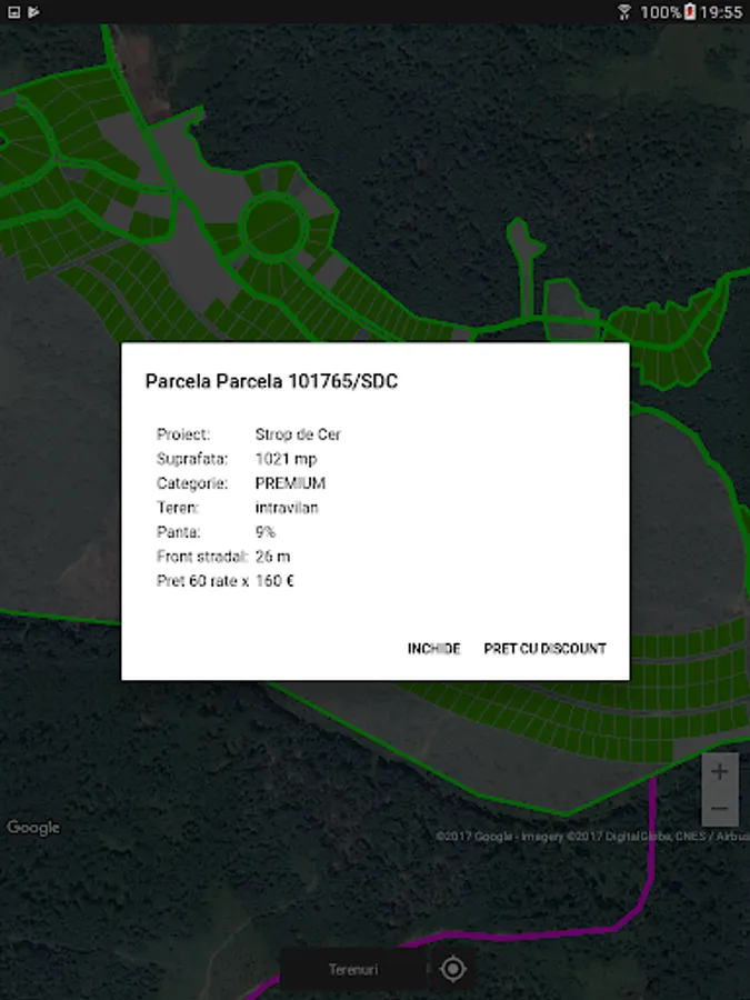 Ea indica cu precizie de +/- 50 cm pozitia parcelelor care sunt la vanzare pe site.