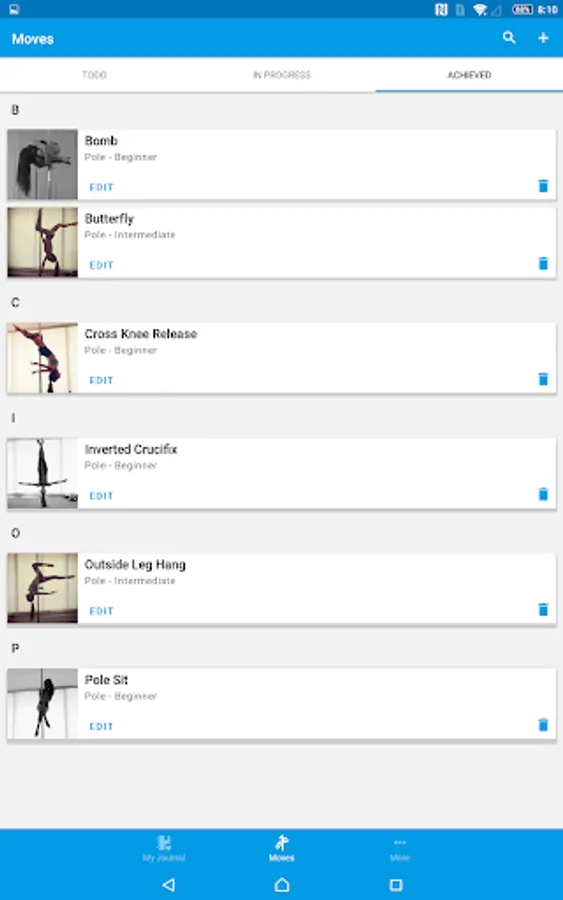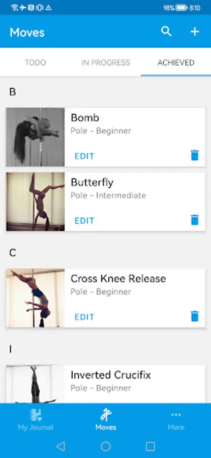 Create your own list of moves. Track the progress by each move with notes, photos and videos. Organize moves by training status (todo/in progress/achieved).