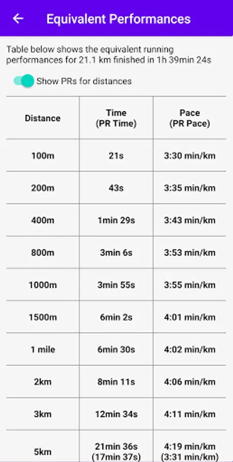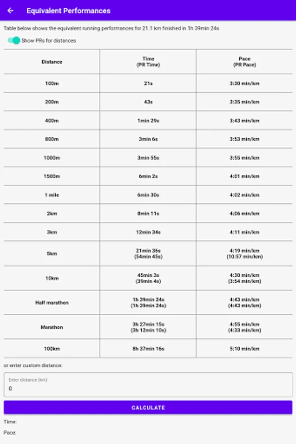- Overview of equivalent performances with comparison to personal records;