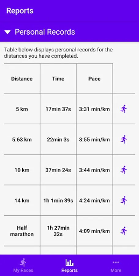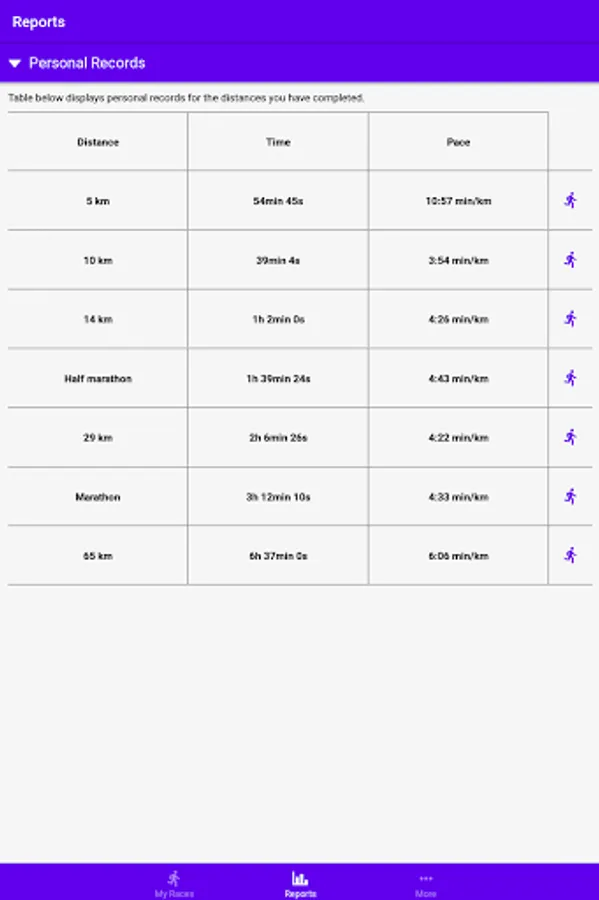 Race Planner will help you to organize your races, give you an overview of the completed races and past performances, and help you with planning your next PR.