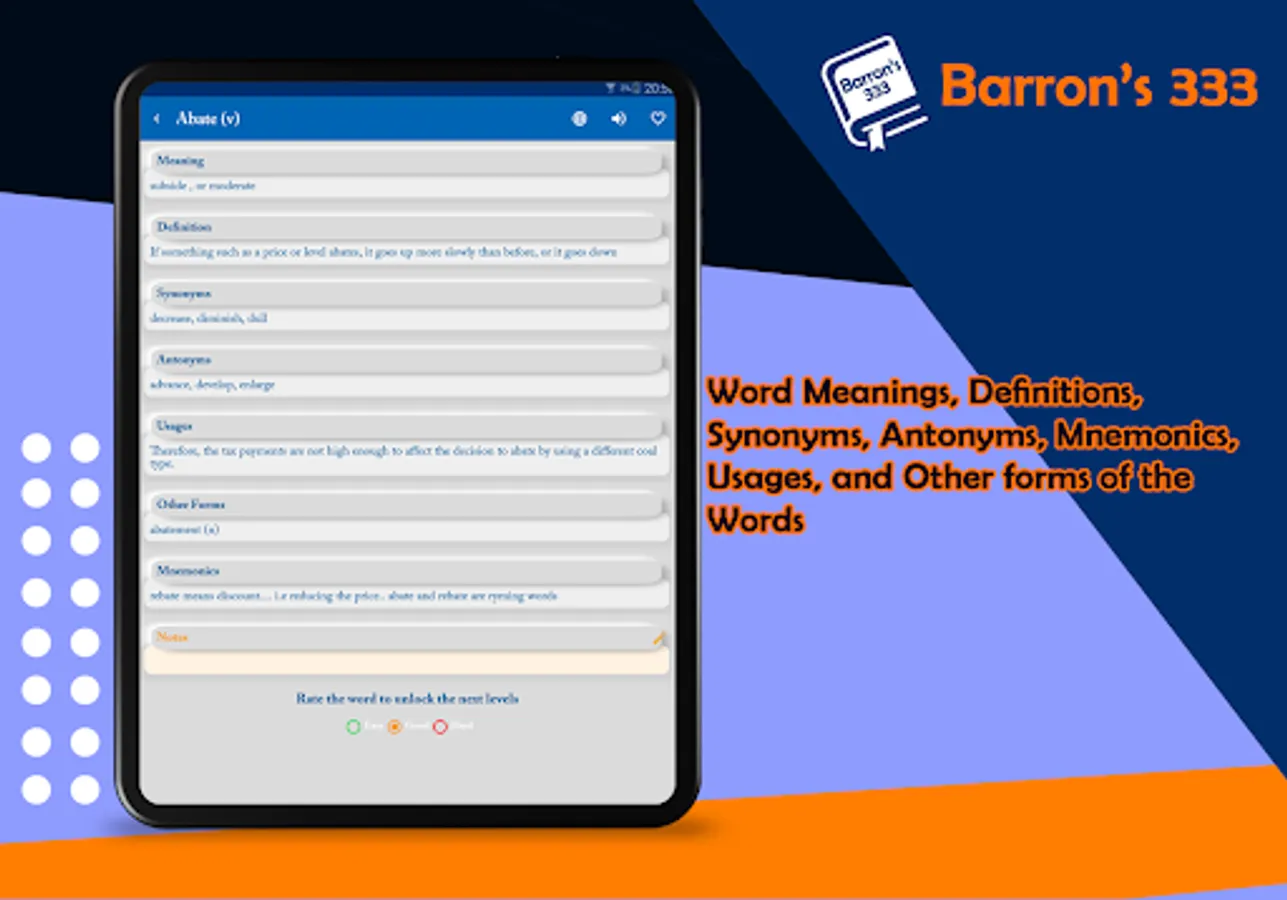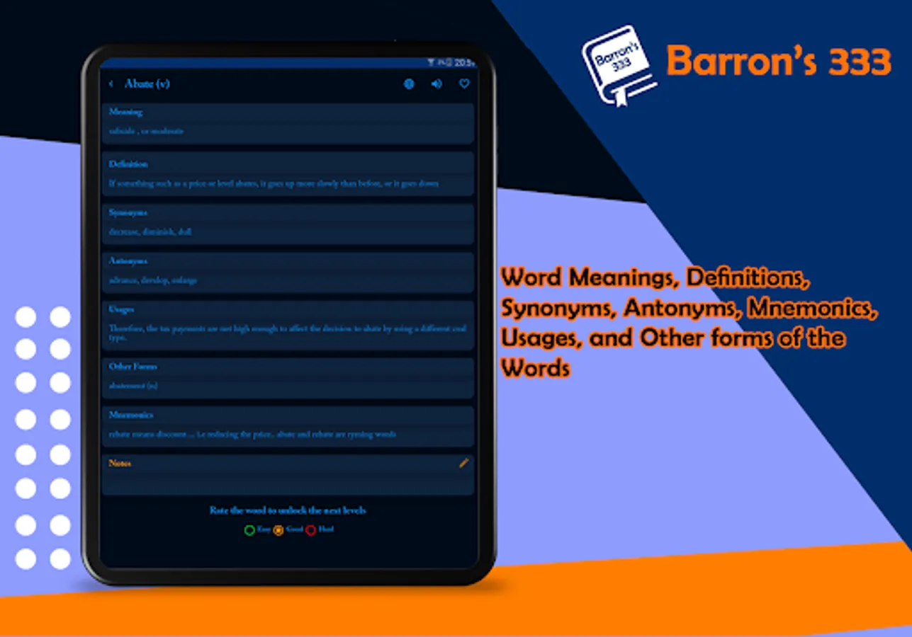 • By using Barron's 333 High-frequency GRE vocabulary builder app you can learn word meanings, word definitions, word usages, synonyms and antonyms of the words.