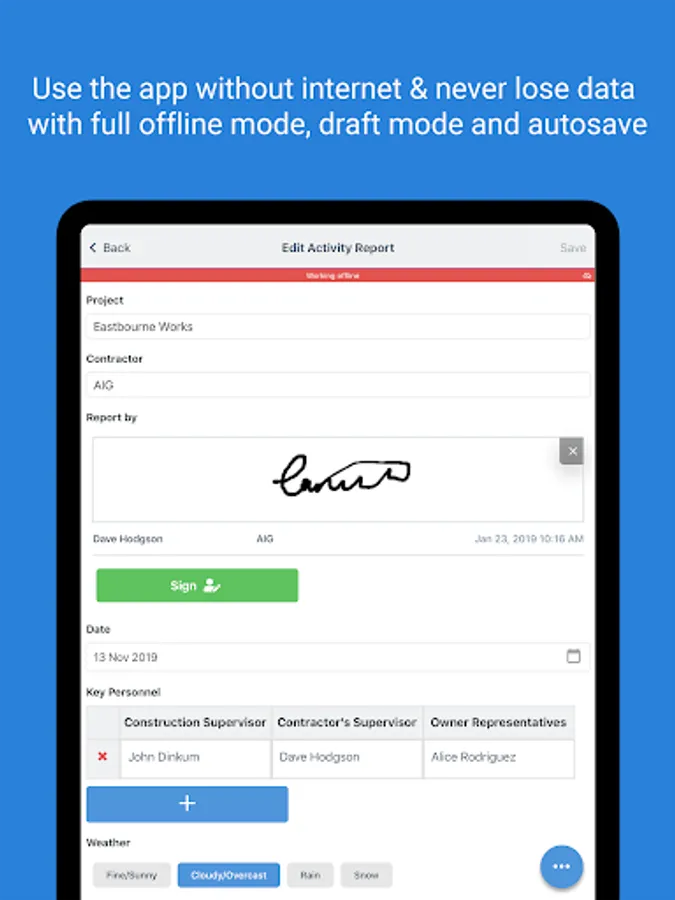 - Form management and completion: Choose, edit and complete smart forms which are always accessible, easy to fill out, instantly cloneable, and can be signed off on tablet or mobile