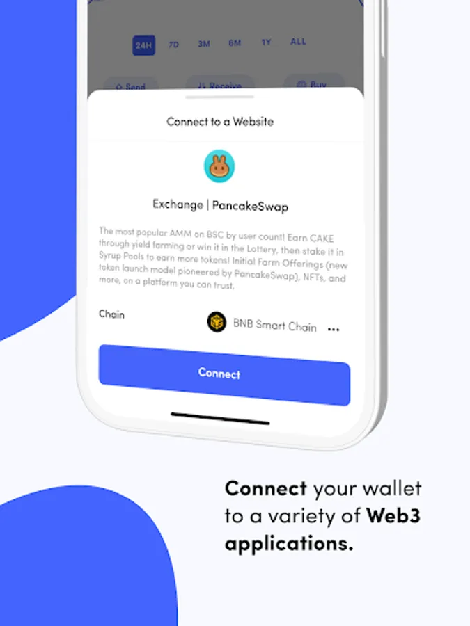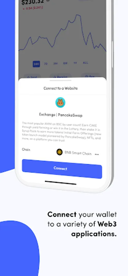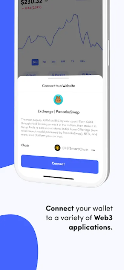 Connect to Decentralised Applications (Uniswap, Pancakeswap, 1Inch) using Wallet Connect.