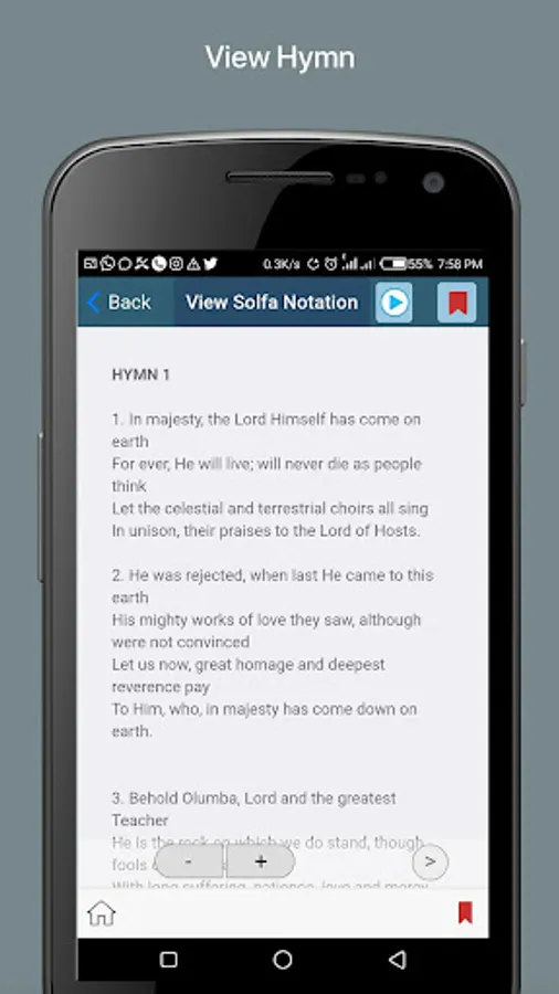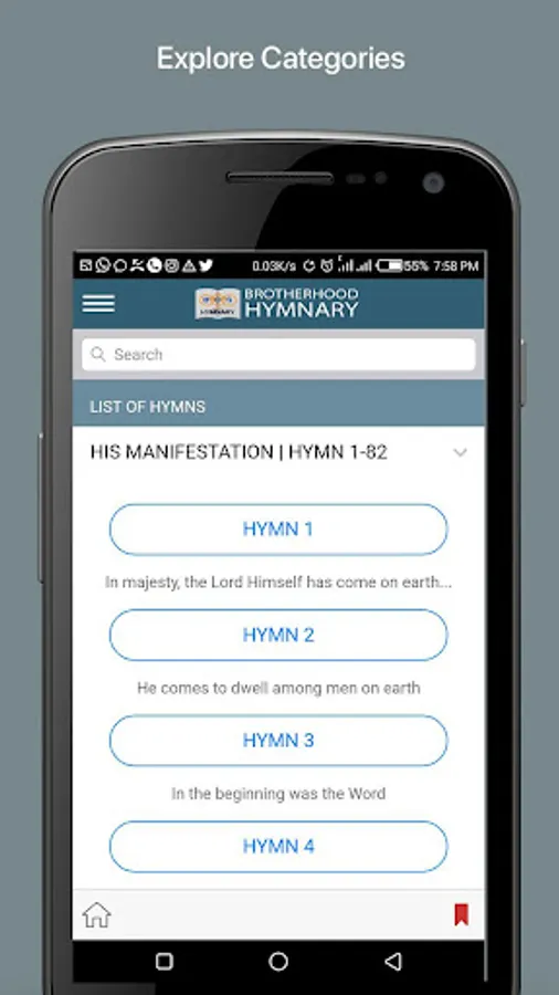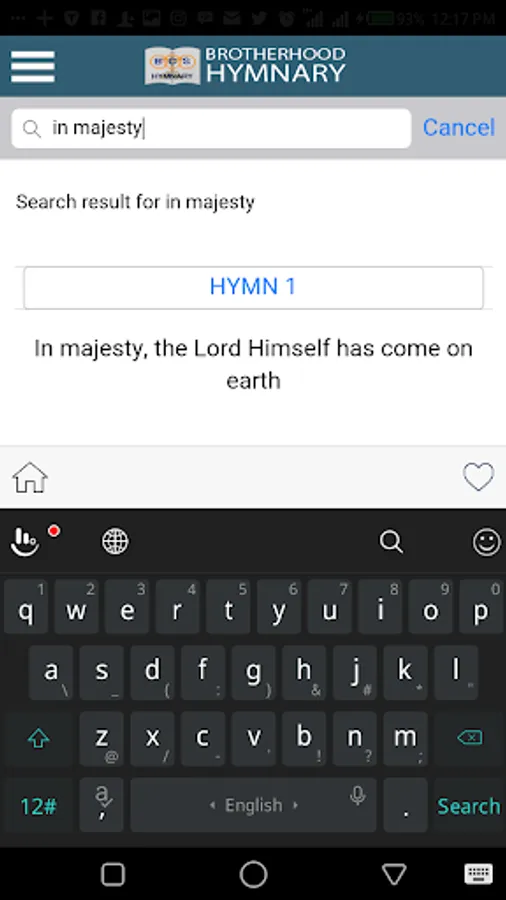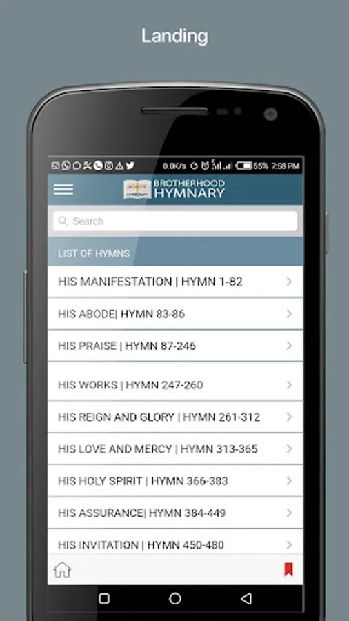 The Brotherhood Hymnary is a comprehensive app contenting all Brotherhood Hymns. This mobile app is an offline application and requires no internet connection to use after the initial download and also has the following capabilities: Hymns can be favorited, searchable either by hymn numbers or first line indexes, zoomed in and out for better viewing, flipped between text and sol-fa notation views, and swiped right to un-favorite hymns.